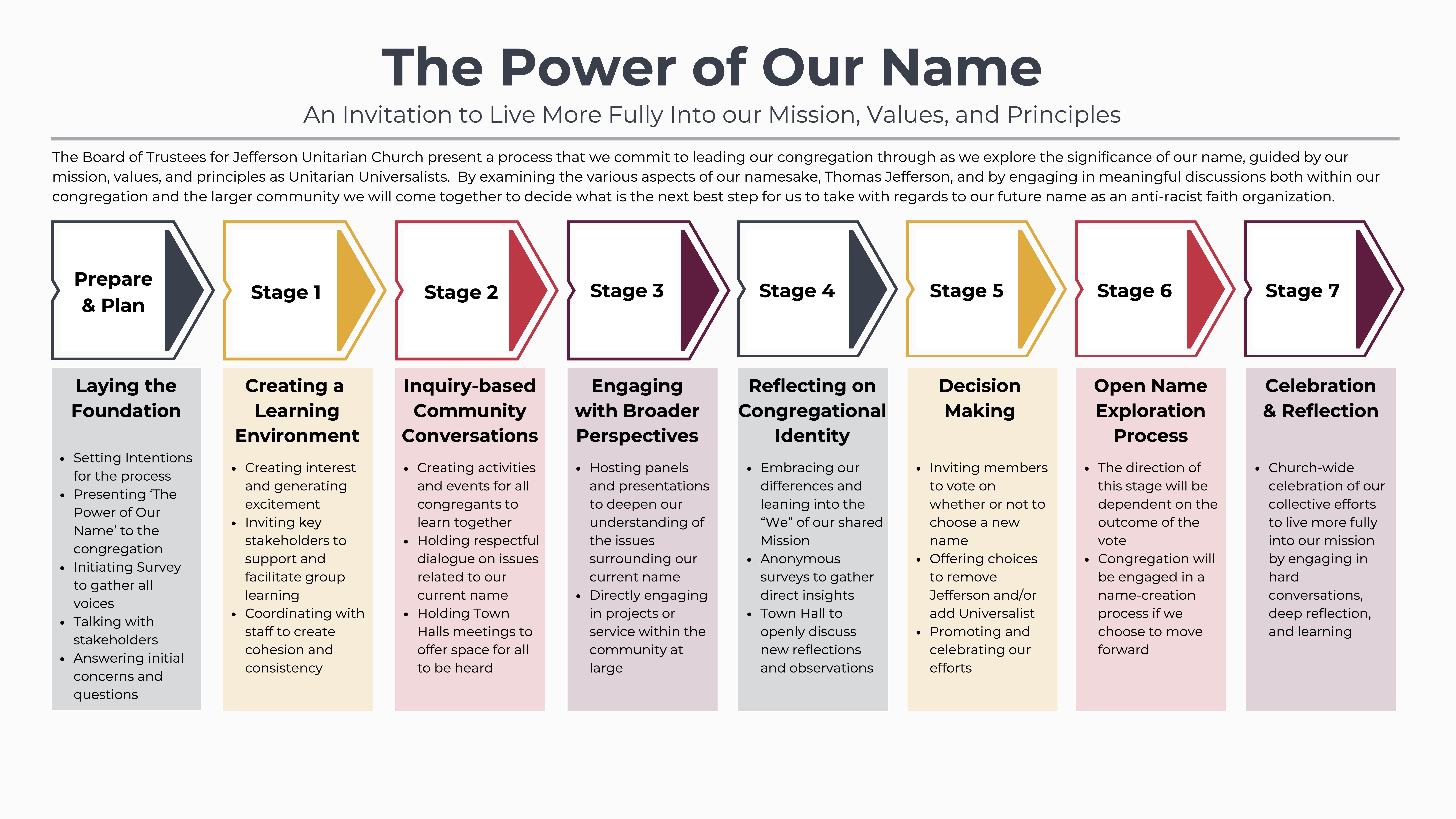 The Board of Trustees for Jefferson Unitarian Church present a process that we commit to leading our congregation through as we explore the significance of our name, guided by our mission, values, and principles as Unitarian Universalists. By examining the various aspects of our namesake, Thomas Jefferson, and by engaging in meaningful discussions both within our congregation and the larger community we will come together to decide what is the next best step for us to take with regards to our future name as an anti-racist faith organization.